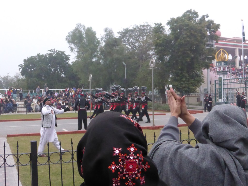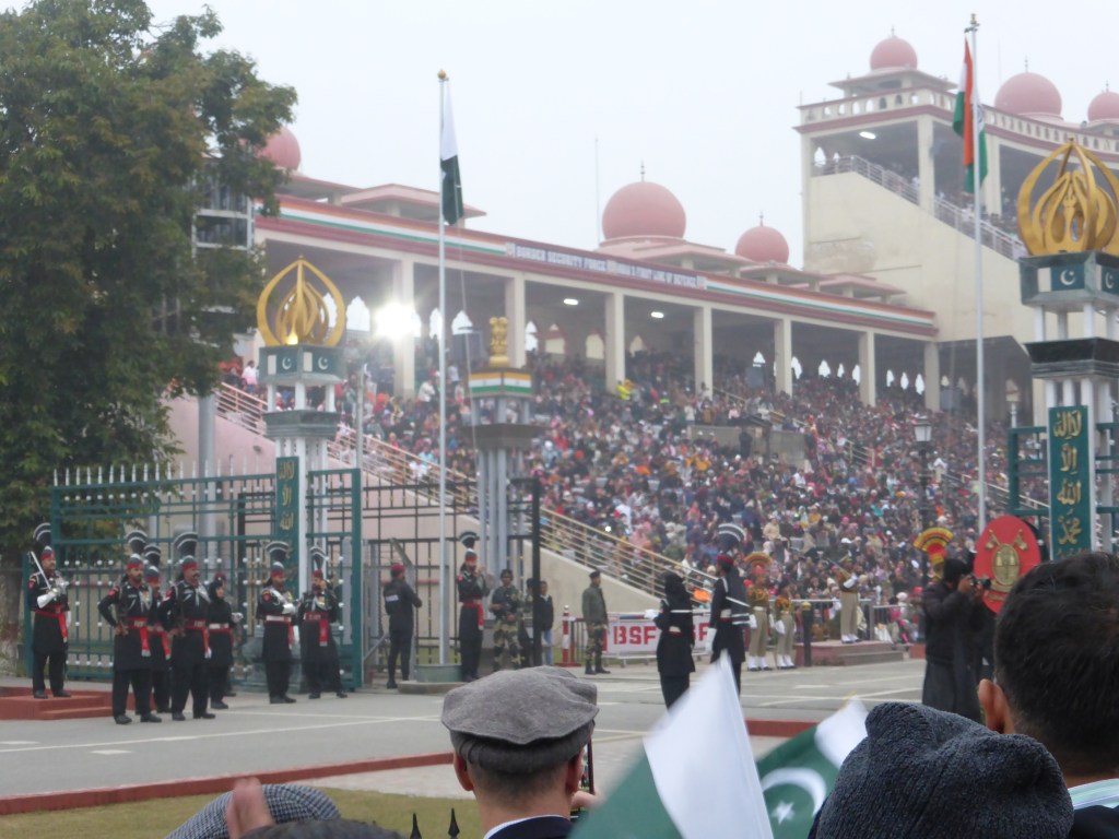 Am 2. Januar sind wir zur Wagah-Grenze zwischen Pakistan und Indien mit einem Taxi gefahren, um die Straße schonmal zu checken und vor allem, um die Grenzzeremonie der Offiziere direkt an der Grenze zu sehen. Wir hatten gehört, dass das ein richtiges Highlight ist und wollten uns das nicht entgehen lassen. Die halbe Stunde vor der Zeremonie lief auf beiden Seiten der Grenze für die Zuschauenden animierende Musik, dabei liefen zwei Männer mit Trommeln herum und feuerten die Zuschauenden an, zu jubeln und ihre Flaggen zu schwenken.