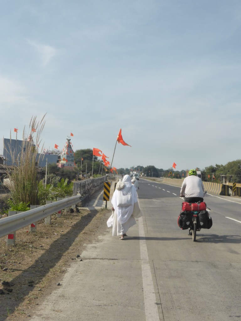 Und immer wieder fahren Mopeds ganz langsam an uns vorbei, schauen uns ganz genau an. Manchmal halten sie 50 Meter vor uns am Straßenrand an, sodass wir um sie herumfahren müssen. Und dann fahren sie kurz danach wieder los und überholen uns nochmal. So hatten sie also eine 360-Grad-Sicht auf uns. Manche fuhren auch einige Meter neben uns her und fragten uns meist auf Hindi, wo wir herkommen und wo wir hinfahren.