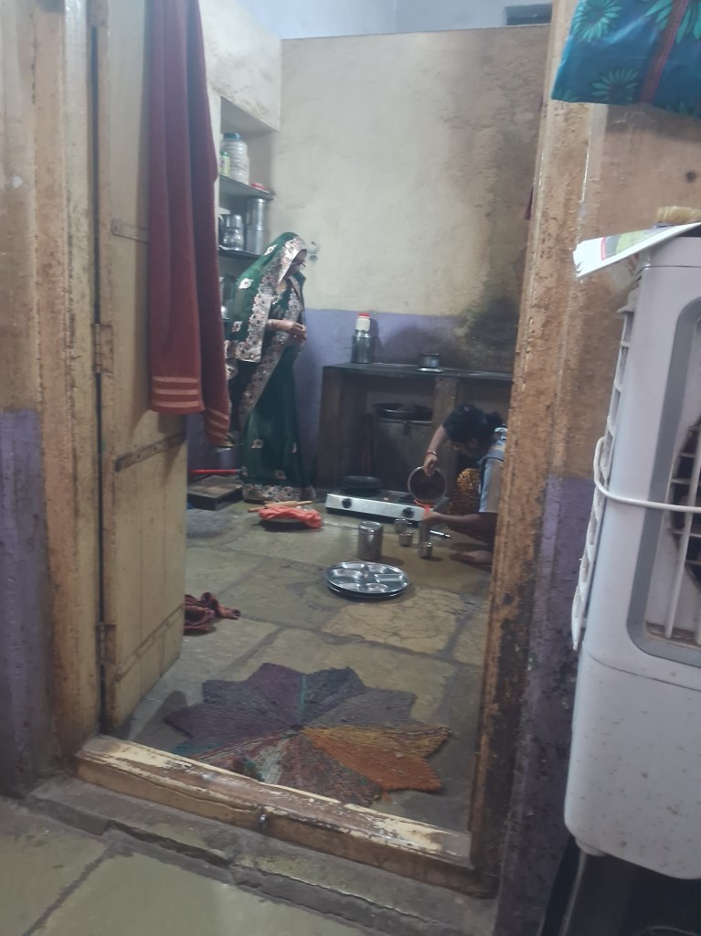 Endlich fanden wir dann zu der Adresse, die wir bekommen hatten, hier war aber nur ein kleiner Tempel, der aus einem Raum bestand, wo Frauen gerade dabei waren, zu beten. Eine Frau die daneben wohnte, erklärte uns, dass wir zu einer anderen Adresse mussten, die sie aber gerade nicht wusste. Erstmal servierte die Familie uns Samosas und Kaffee, und dann sollten wir dem Sohn auf dem Roller zum Vater der Familie in seinem Herrenmodeladen folgen, denn er weiß die Adresse.
