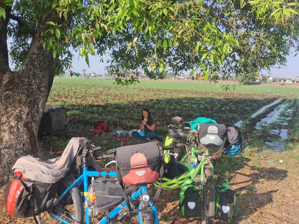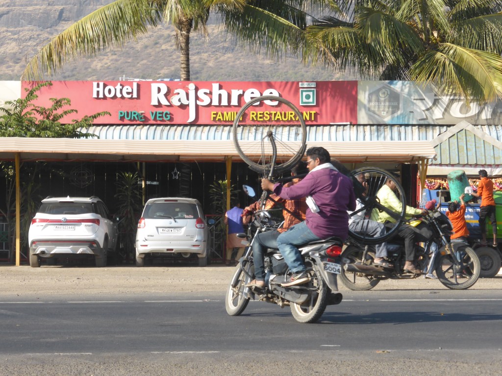 Am Dienstag, den 6. Februar packten wir also um 8 Uhr alles an unsere Fahrräder und bekamen pünktlich ein reichhaltiges Frühstück mit Reisküchlein (Idli), frittierten, salzigen Linsendonuts (Vada) und mit Kartoffeln gefüllte Reiscrêpes (Dosa) mit Sauce und Kokoschutney. Und noch ein Chai. So konnten wir wirklich gut gestärkt in den Tag starten und tatsächlich lief es heute richtig gut bei uns! Es war noch kühl, also ca. 25 Grad Celsius, wir waren ja auch früh, also um 9 Uhr losgekommen, es war noch nicht so viel los auf der Straße und es ging auch noch leicht bergab. So vergingen die ersten 20 Kilometer wie im Flug. Unser heutiges Ziel, die etwas größere Stadt Nashik, war gar nicht mehr so weit entfernt, also konnten wir wieder eine entspannte Mittagspause machen.