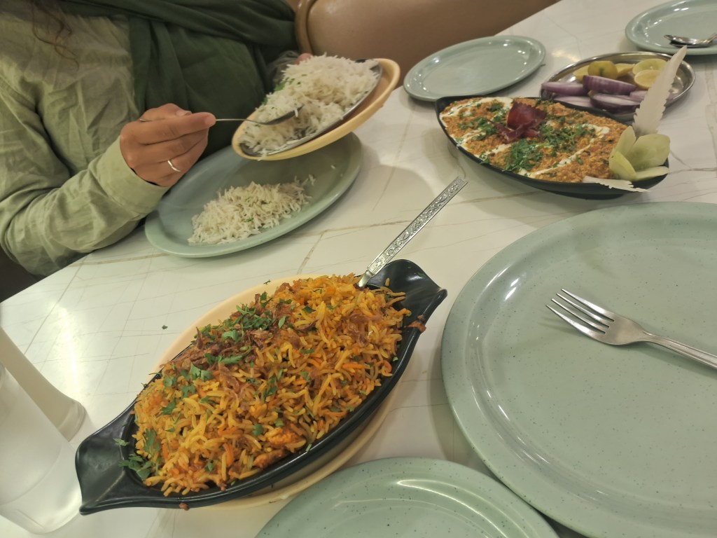 Das Hotel liegt etwas außerhalb der Stadt und ist, wie viele Hotels, auch ein Veranstaltungsraum für Hochzeiten, Geburtstage und Anderes. Heute war eine Verlobungsparty und es waren viele festlich angezogene Menschen da, die auf dem dekorierten Gelände Fotos machten. Wir bekamen ein schönes Zimmer, duschten und durften sogar noch auf seine Kosten Abendessen. Wir suchten uns heute echt leckere Gerichte aus: Paneer Korma und veg Biryani Rice. So waren wir abends doch noch ziemlich zufrieden, auch wenn der Tag bisher wohl der anstrengendste für uns war.