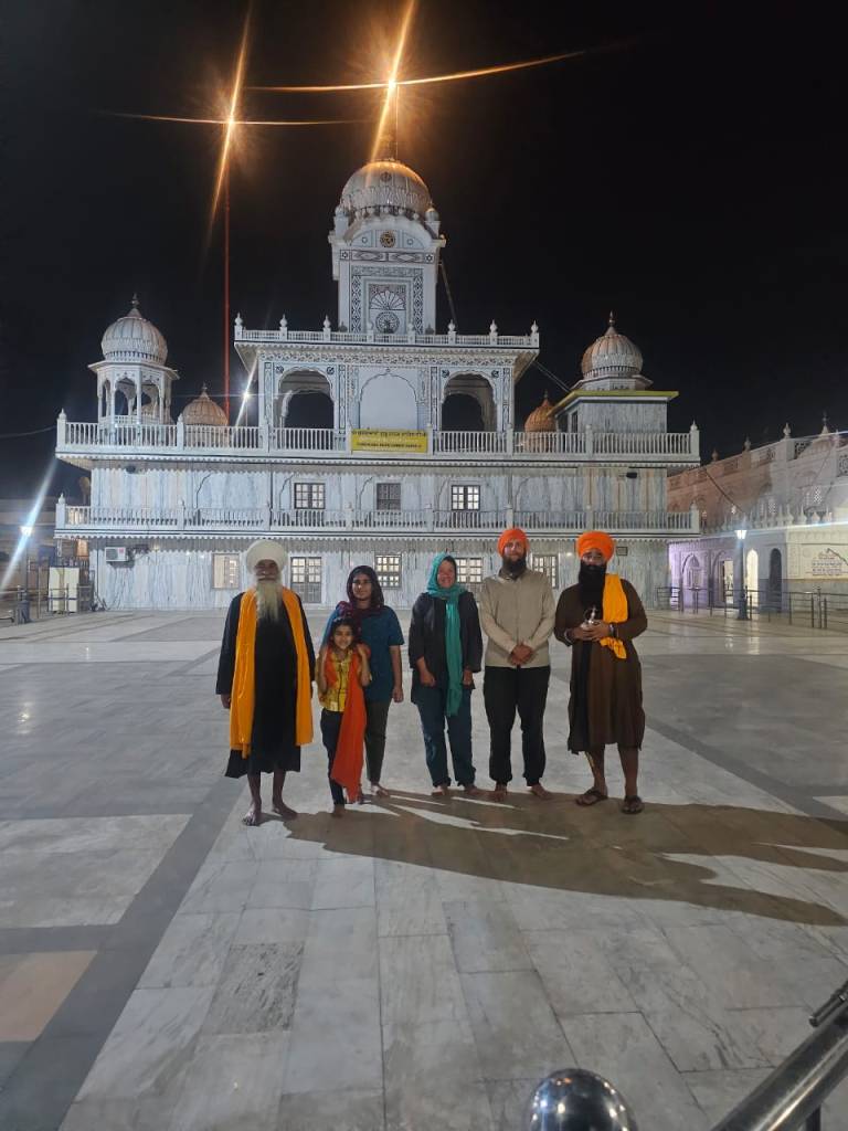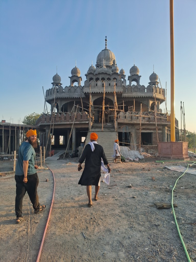 Dann kamen wir auch schon bei der Adresse an, die uns Harry gezeigt hatte. Es war eine Autowerkstatt mit einem Wohnhaus darüber, wo wir hinein eingeladen wurden. Wieder mal sprach die Tochter des Hauses gutes Englisch und wir unterhielten uns mit ihr. Die Familie wollte uns gerne kennenlernen und hatte Sandwiches und Bananenmilch für uns vorbereitet. Dann wollten wir uns gerne noch den Gurudwara anschauen und fuhren mit den Fahrrädern voraus, der Vater und die Tochter wollten dann nachkommen. Im Gurudwara schauten wir uns den Gebetsraum an, bekamen Tee und durften uns noch den im Bau befindlichen neuen Gurudwara anschauen und uns wurde alles gezeigt.