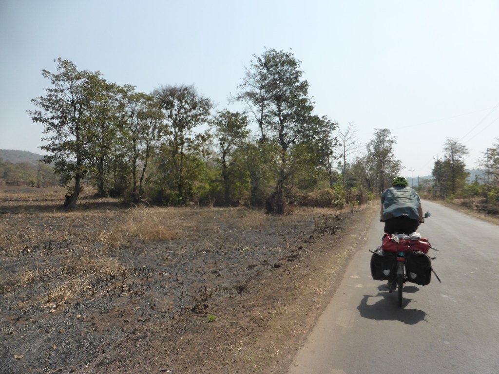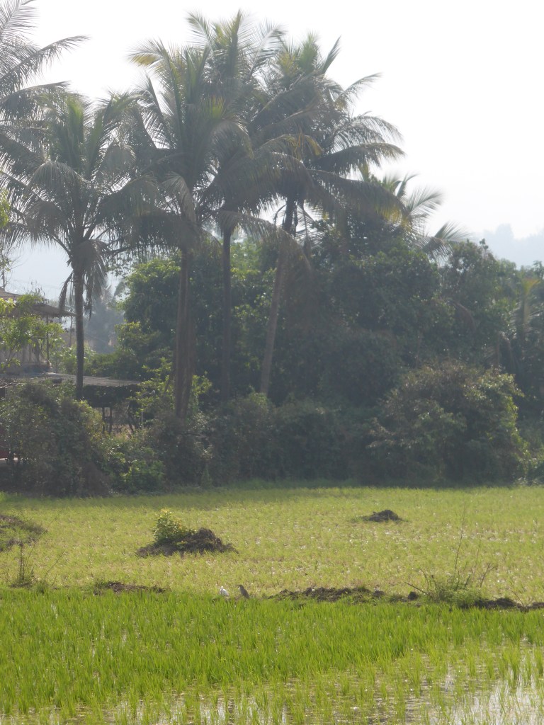 Wenn wir mal nicht auf die Straße achten müssen, sehen wir heute wieder einige Palmen, aber auch Reisfelder und teilweise auch brennende Felder, das wird hier oft nach dem Abernten gemacht. Den genauen Grund und ob das schlau ist, wollen wir noch herausfinden.