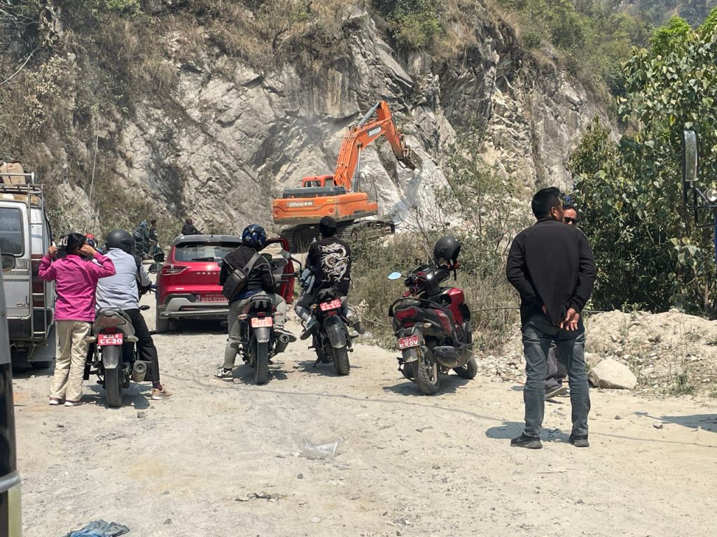 Unten war wieder ein Fluss, den wir über eine Brücke überquerten und dann ging es bergauf und bergauf und bergauf. Auch heute gab es kurze Strecken mit Schotterweg. An einer Stelle war ein großer Bagger dabei, den Felsen zu zertrümmern, um die Straße breiter zu machen. Während er arbeitete, mussten die Fahrzeuge warten und immer wieder fuhr er zur Seite, um den Verkehr durchzulassen. Als wir dort ankamen, wollte der Bagger gerade wieder zur Arbeit, als wir vom Einweiser bemerkt wurden und dieser uns anwies, schnell auf dem Schotter am Bagger vorbeizufahren. Naja, schnell war nicht so einfach, aber wir gaben unser Bestes, um die Arbeit nicht aufzuhalten.
