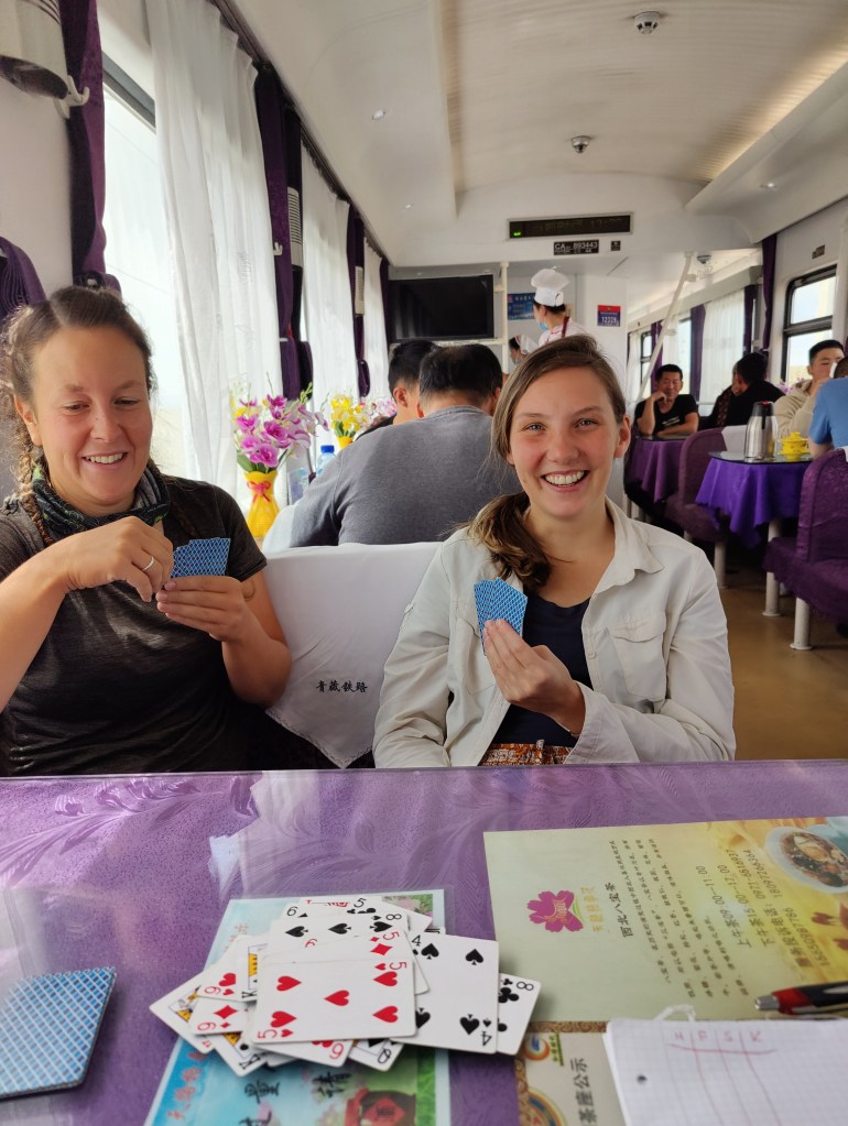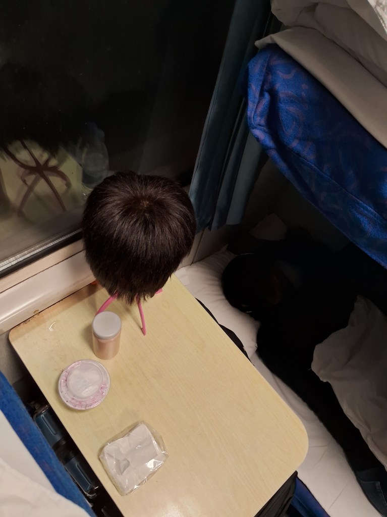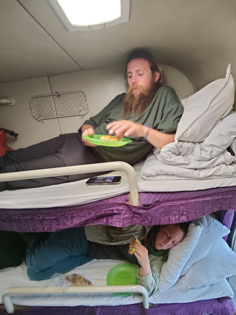 Nach zwei Runden “Yaneef” gingen wir wieder zurück zu unseren Betten, wo das Ehepaar unter uns am Aufräumen und Zusammenpacken war. Kurz danach hörten wir eine Durchsage, dass alle Passagiere den Zug wechseln müssen und dann erklärte eine Zugbegleiterin uns mit dem Handyübersetzer dass der andere Zug am selben Bahnsteig gegenüber steht und dass der Zug gleichwertig sei. Also packten wir auch schnell alles zusammen und freuten uns gar nicht, dass wir unerwartet alle Taschen schultern und in einen anderen Zug packen mussten. Aber eigentlich verlief der Wechsel ganz gut, wir konnten unsere neuen Betten beziehen und das Gepäck verstauen. Leider hatte der Zug zwischen den Abteilen ein Raucherbereich und wir liegen direkt daneben. Und natürlich müssen Raucher*innen, wenn sie die Möglichkeit haben, andauernd rauchen. Das Schlimmste war, dass durch die Lüftungsanlage direkt über unseren Köpfen die rauchige Luft rauskam. Wir machten etwas Stress, die Zugbegleiterin versuchte ganz freundlich, eine Lösung Zu finden, konnte aber nur anbieten, dass sie Raucher*innen bitten kann, die Durchgangstüren zu schließen oder woanders und weniger zu rauchen. Naja.