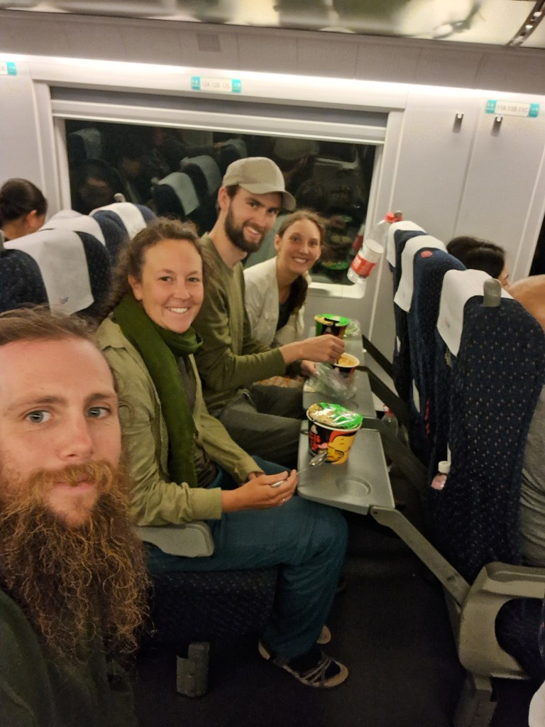 Irgendwann waren alle wach, das Ehepaar unten kannte gefühlt den ganzen Waggon, es kamen immer wieder Leute zum quatschen vorbei, unten konnte man ganz gemütlich sitzen. Manchmal fuhr ein Wagen mit Essen oder verpackten Obst und Gemüse vorbei, aber wir hatten ja genug dabei…