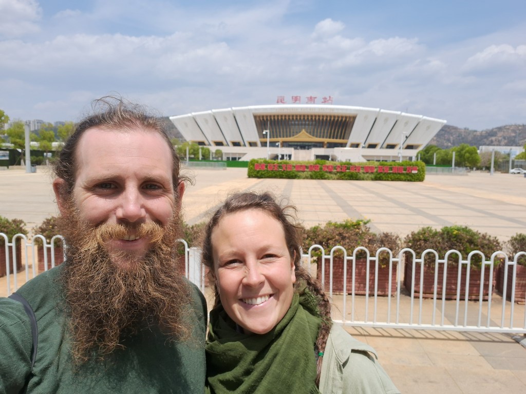 Wir fuhren 5 Stunden mit teilweise 292 km/h nach Süden bis Kunming, dem Endbahnhof. Dort suchten wir uns erstmal ein Café mit Wlan, um nach einer Unterkunft zu suchen. Wir fanden ein günstiges Zimmer für uns vier und nahmen ein Taxi, weil wir unsere vielen Taschen nicht so weit tragen konnten.