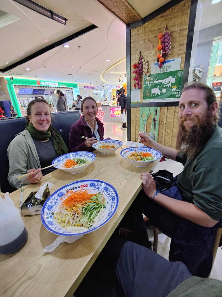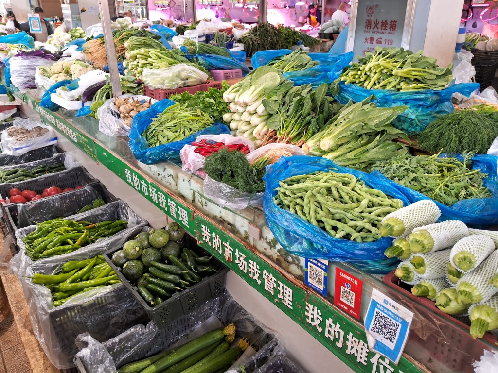 Es war etwas schwierig, das Hotel im fünften Stock eines Hochhauses zu finden, aber wir schafften es dann doch und konnten für drei Nächte einchecken. Hier warteten wir auf unsere Fahrräder, die wenige Tage später in Kunming ankamen. Inzwischen probierten wir die Nudelsuppen in den Restaurants in der Nähe aus und bewunderten, was es in chinesischen Supermärkten und in der Markthalle so gibt.