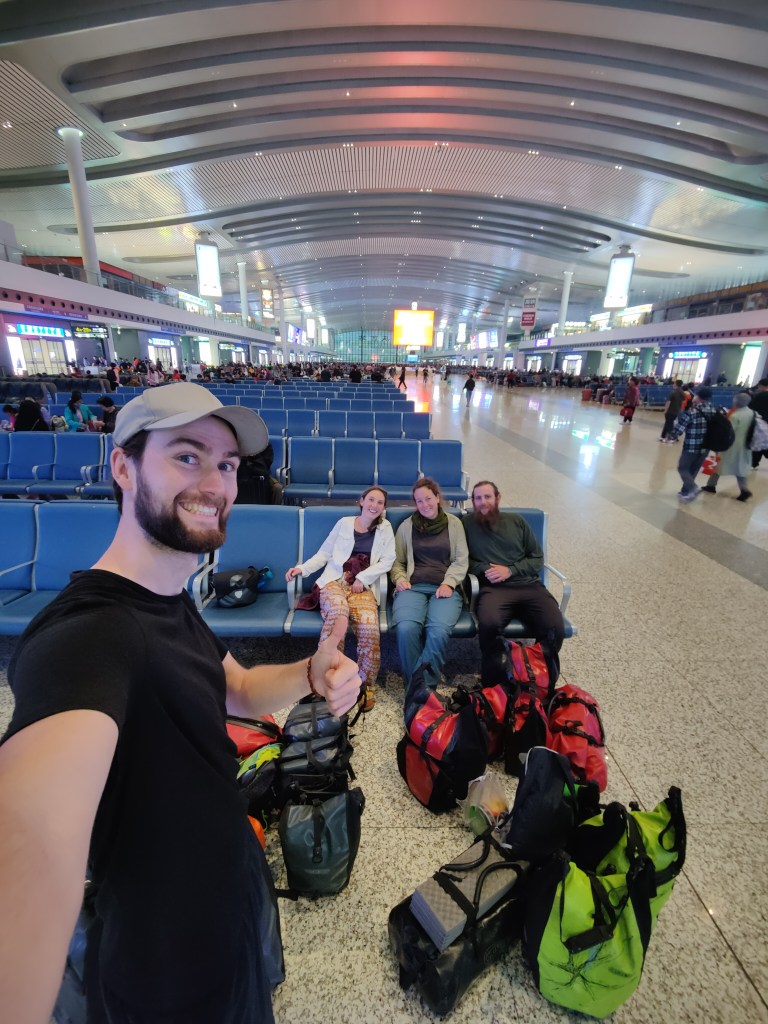 Am 22.4. ging das Licht schon sehr früh an, denn um 6:30 Uhr kamen wir schon in Chongqing an, wo wir den Zug wechseln mussten. Etwa eine Stunde vor Ankunft in Chongqing lief eine Zugbegleiterin durch den Zug und sagte wohl, dass man sich bereit zum Aussteigen machen sollte. Wir stellten all unsere Fahrradtaschen bereit und kamen pünktlich an. Am Bahnhof gingen wir direkt in die große Wartehalle für den nächsten Zug.