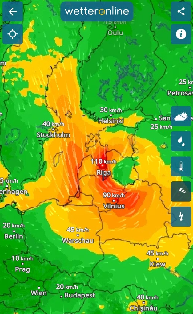 An dem Parkplatz beim See kam noch ein Schwede vorbei, der meinte: Bei dem aufkommenden Sturm heute Nacht solltet ihr drinnen schlafen! Wir wägten Alternativen ab und entschieden uns dann, doch nochmal 40 Kilometer in die nächste Stadt mit nicht mega teuren Hotels und einem Bahnhof zu radeln, um am nächsten Tag mit dem Zug nach Vilnius in einen guten Fahrradladen zu fahren. Das Gewitter war auf der Karte wie eine Spirale eingezeichnet und je nachdem, wo das Zentrum ist, würden wir Gegen- oder Rückenwind haben…