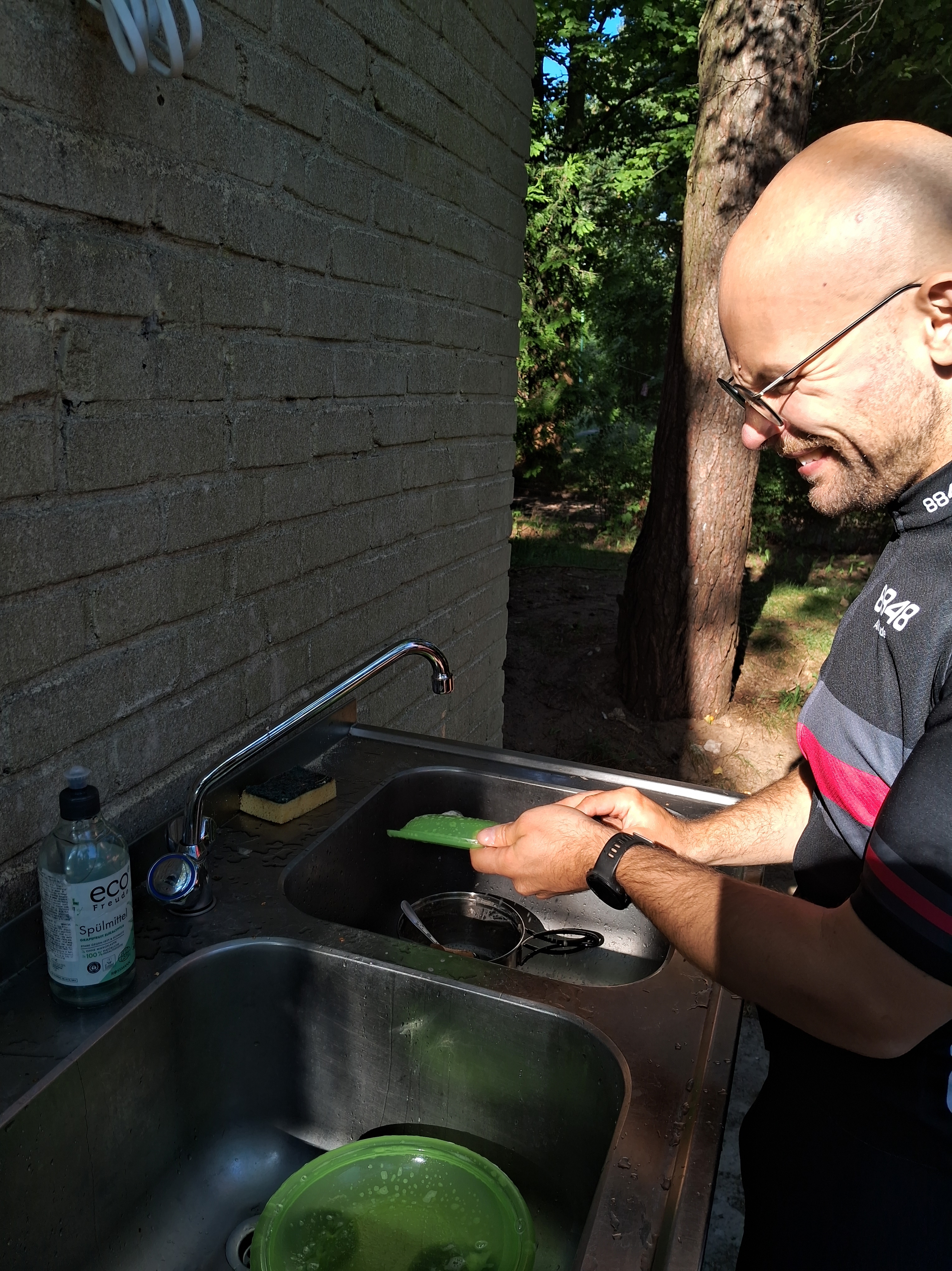 Abends kamen wir an einem Campingplatz an, wo nichts los war und wir eine große Auswahl eines Zeltplatzes hatten. So baute Max sein Zelt auf und wir beide unseres. Dann wollten wir erstmal noch in die Ostsee hüpfen, diese lag etwa 100 Treppenstufen tiefer direkt neben dem Campingplatz. Im Wasser waren Quallen, darum wolten wir nicht sooo lange im Wasser bleiben. Endlich konnten wir mit Toni (dem Duschbrocken) duschen. Wir hatten den Duschbrocken wirklich vermisst! Zum Abendessen kochten wir leckere Nudeln mit Pesto.