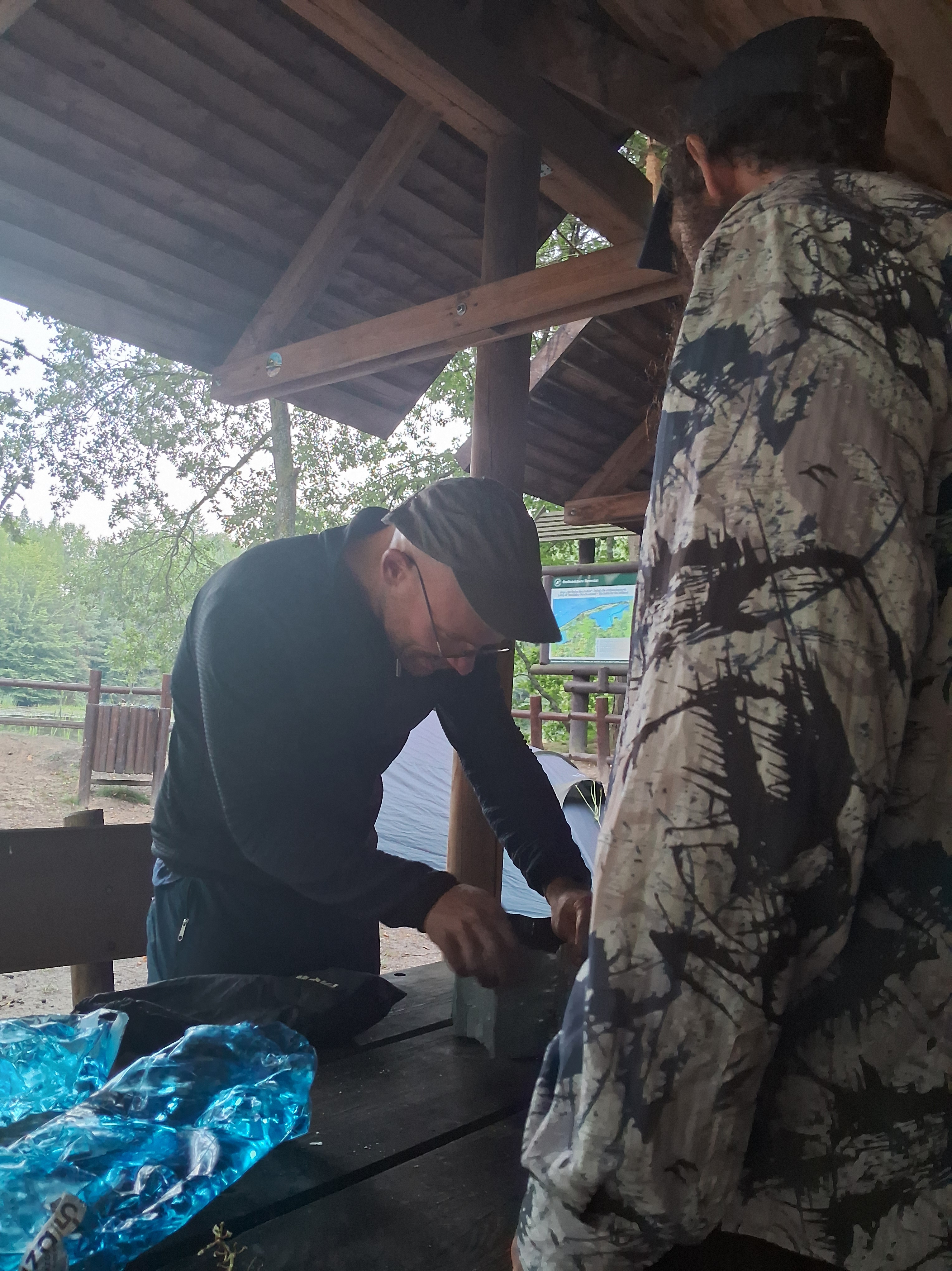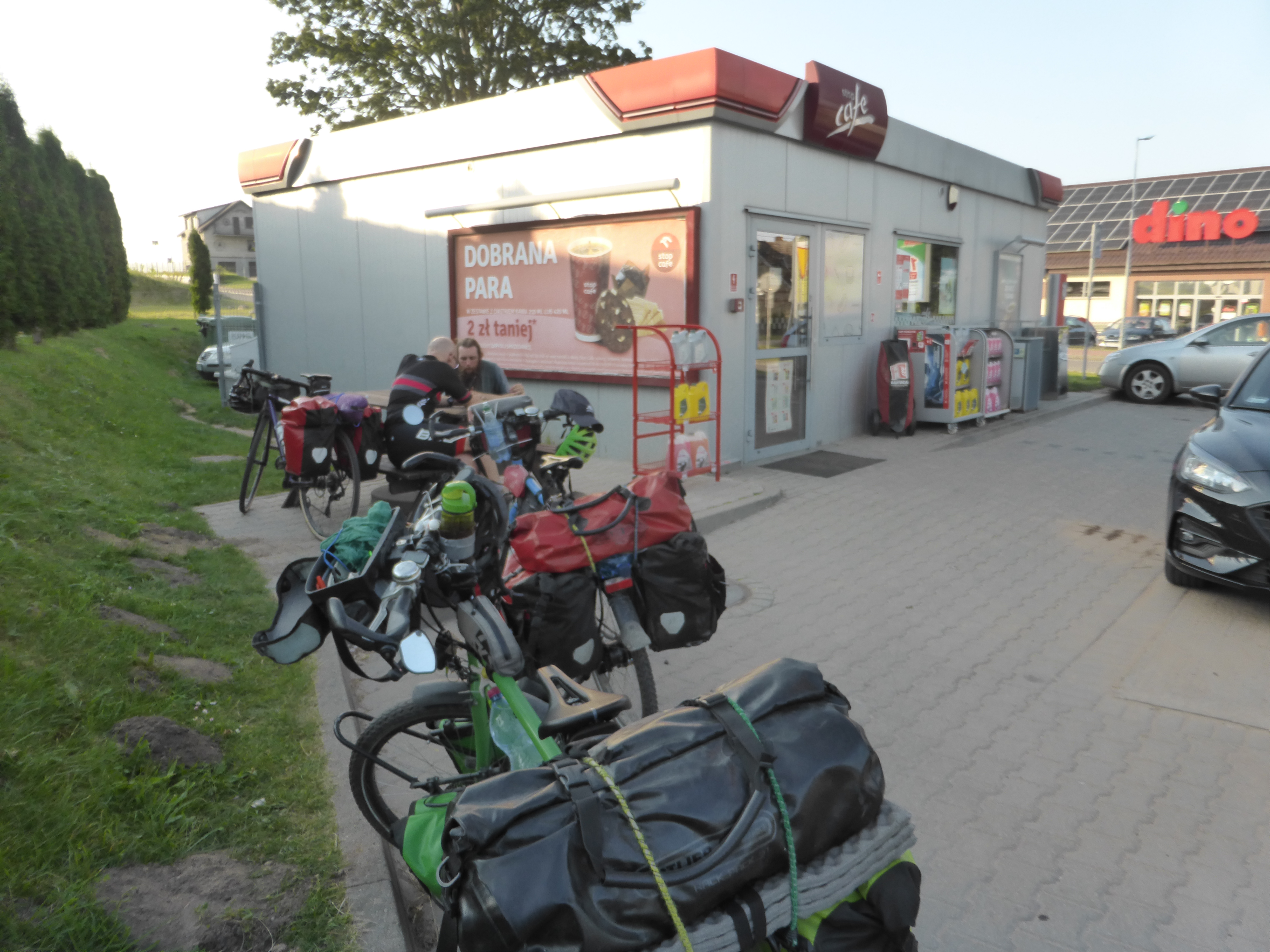 Teilweise konnten wir uns über Radwege an Straßen freuen! Max war mit seinem gravelbike und nur 2 Taschen schneller (?) unterwegs, vor allem bergauf, aber er fuhr dann immer wieder langsam, bis wir wieder aufgeholt hatten. Für den Abend hatten wir uns eine Wandererschutzhütte an einem kleinen See im Wald ausgesucht, wo wohl schon andere Radfahrer*innen in der Vergangenheit gezeltet hatten. Wir kamen dort also nach genau 100 Kilometern an, bauten unser Zelt neben der Hütte auf und machten mit dem Kocher Wasser für die Pierogi heiß, die wir im Supermarkt gekauft hatten.