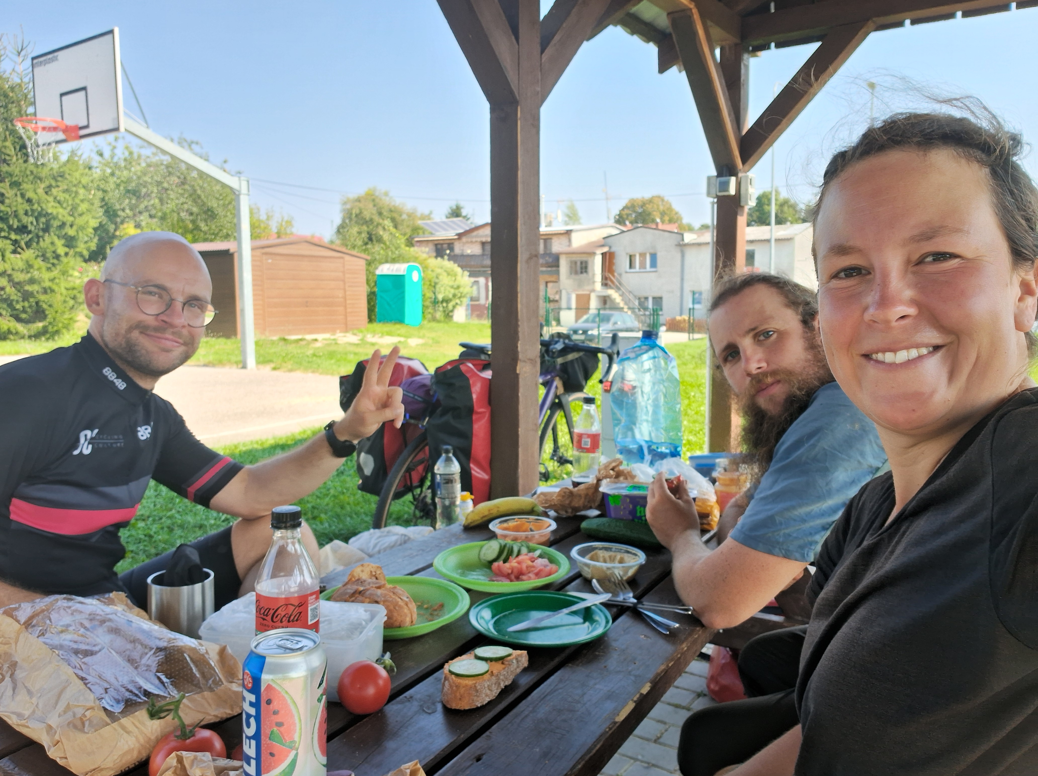 Mittagessen kauften wir in einem Dorfladen, und aßen im Wald an einem Tisch mit Bänken. Das war gut, fanden wir alle drei. Weiter ging es durch den Wald, immer wieder auf dem Eurovelo 10, bis dieser irgendwann auf eine Sandpiste im Wald führte. Wir schoben unsere drei Fahrräder durch den Sand und suchten dann lieber richtigere Straßen aus.