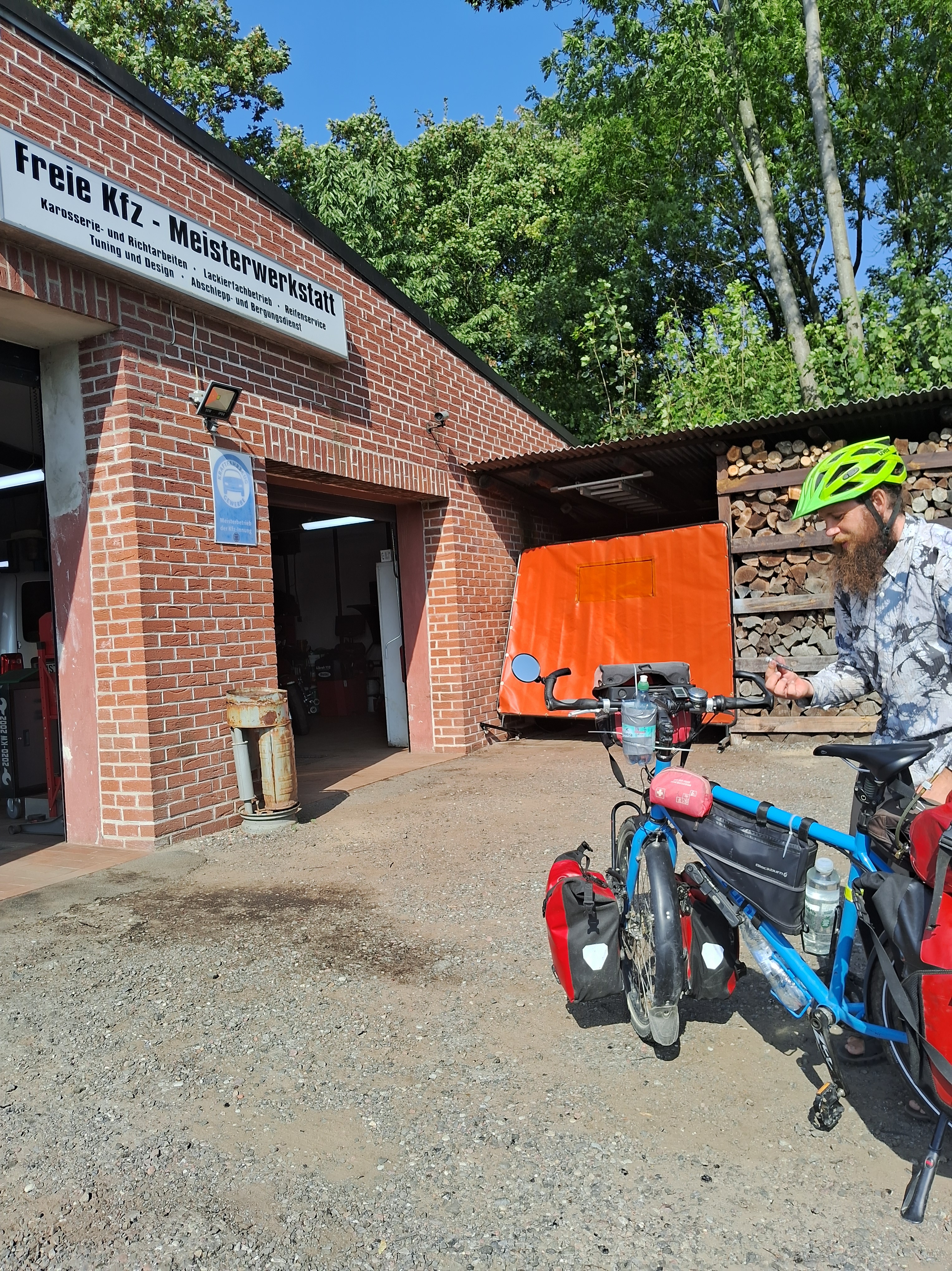 Zum Glück ging es von dieser Erhebung erstmal bergab bis zum nächsten Dorf, wo wir vor einer Autowerkstatt mit einem 8er Inbus unsere Ersatzpedale einbauen, die wir ja schon seit Wien dabei hatten und nun echt brauchten.