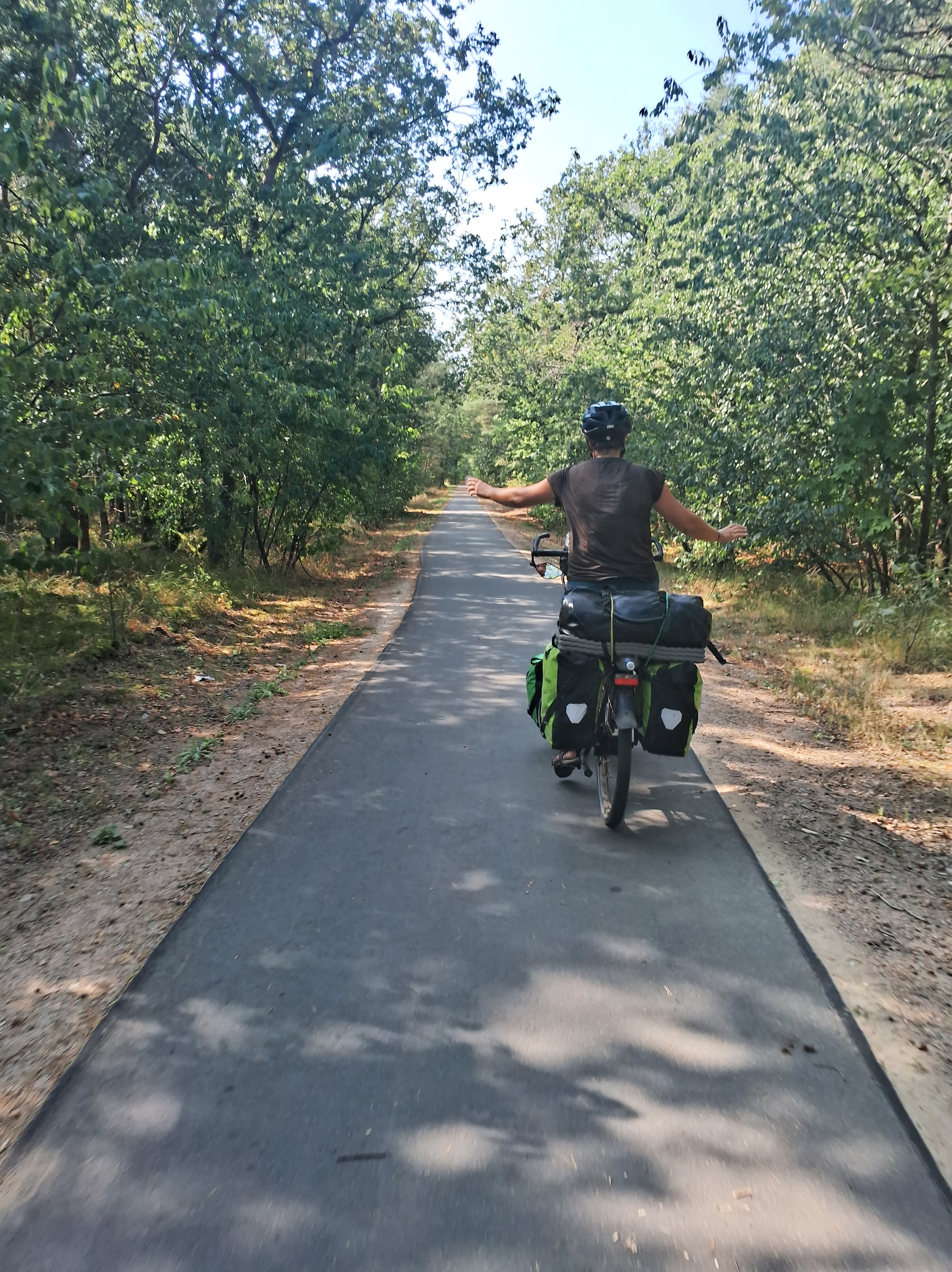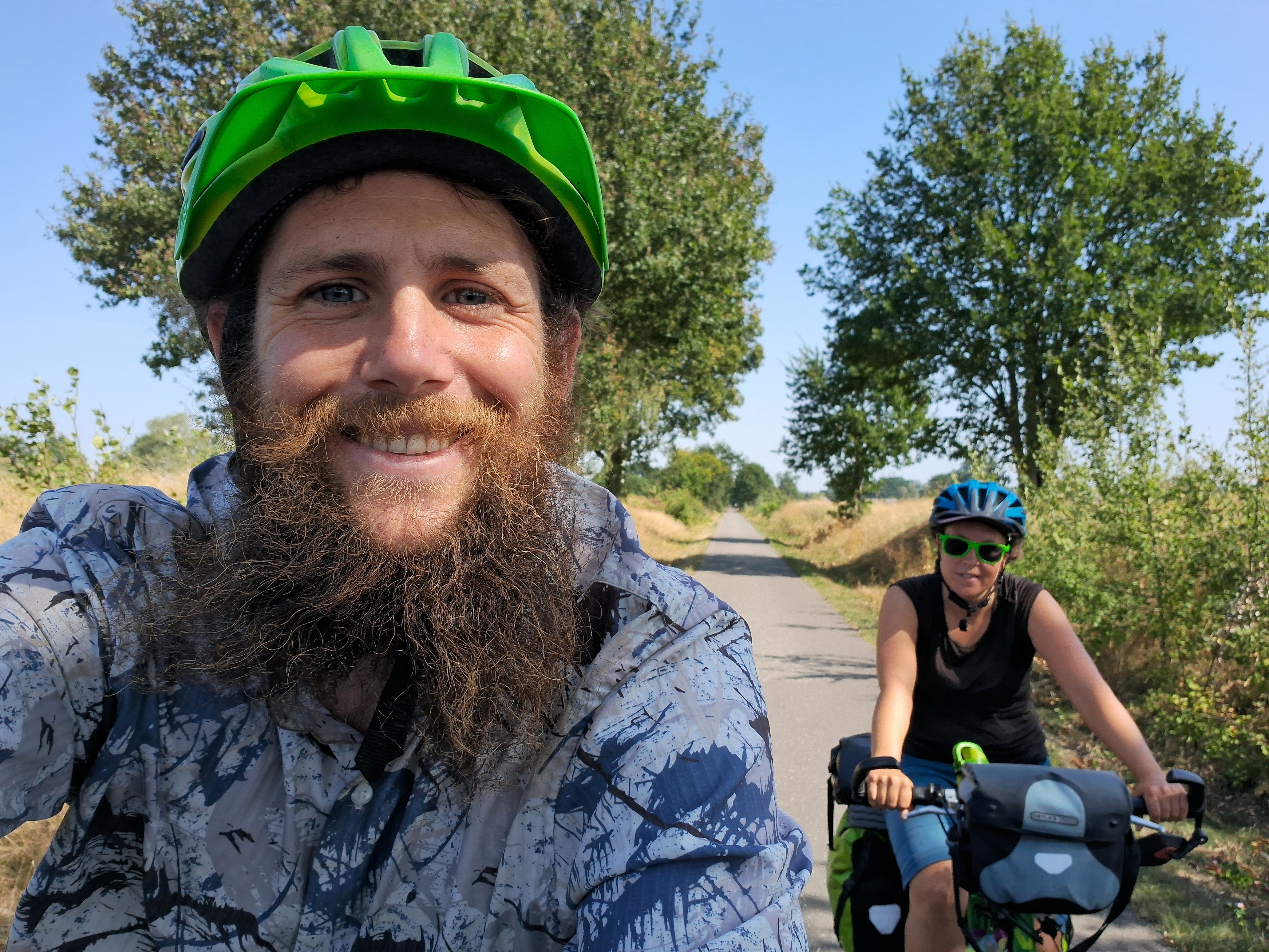 Direkt nach der Grenze grüßte uns ein Polizist mit einem einfachen „Hallo“ und es war so neu, in unserer Muttersprache begrüßt zu werden. Es gibt gute Radwege, die durch den Wald führen. Wenn die Straße flach ist, führt der Radweg jedoch über einige Hügel und durch Kurven, die für uns nicht nötig gewesen wären. Auch ist gefühlt der Radweg der beste Ort, um Straßenschilder und Laternenmasten drauf zu stellen und der Bordstein ist halt auch nicht immer abgesenkt auf den Fahrradwegen… Der Rückenwind ist super, aber bei über 30 Grad kühlt er einfach nicht…