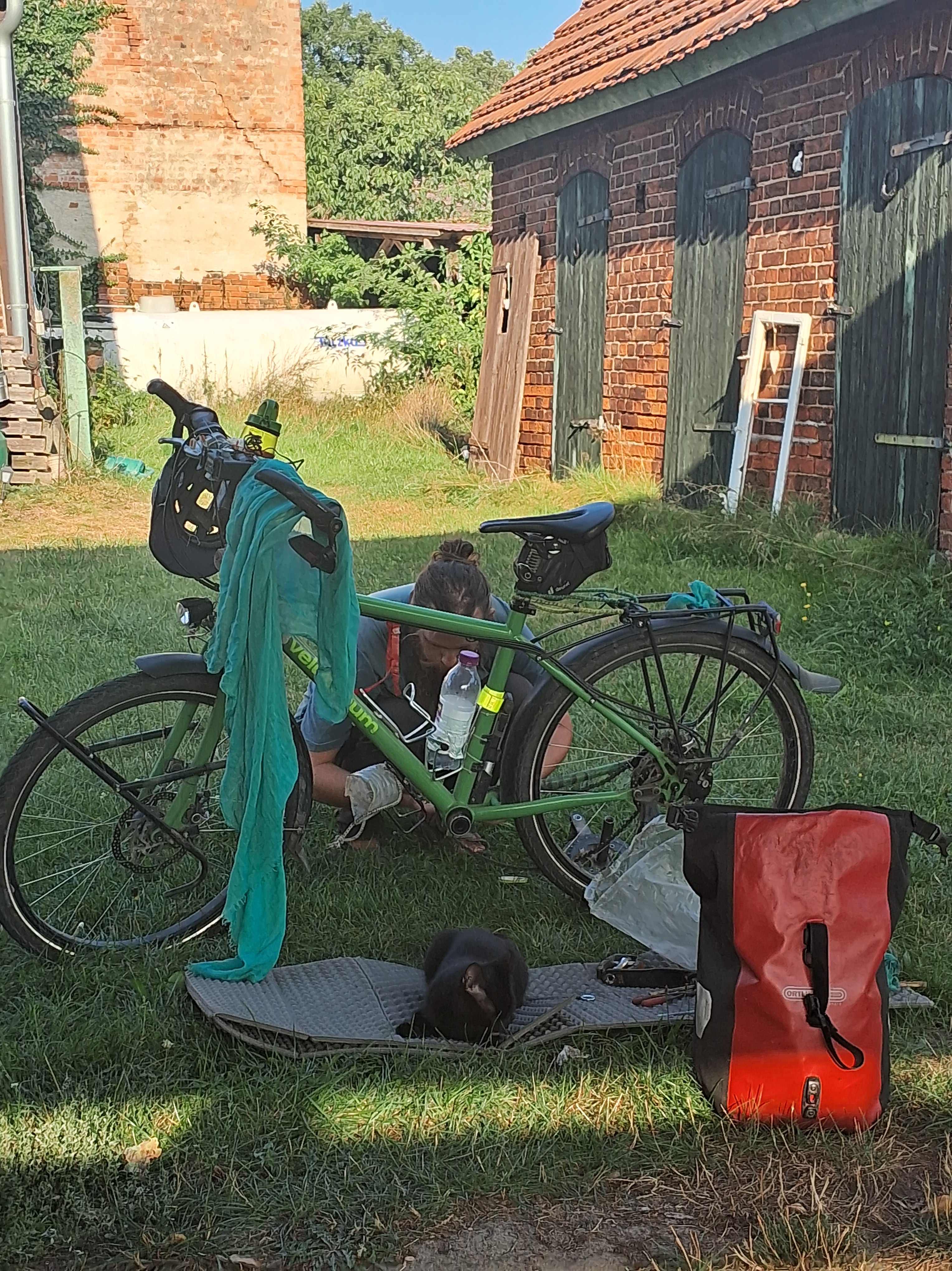 Morgens am 7.9. machte sich Simon dran, Karins Tretlager säubern, das gestern ein Orchester an Geräuschen machte.