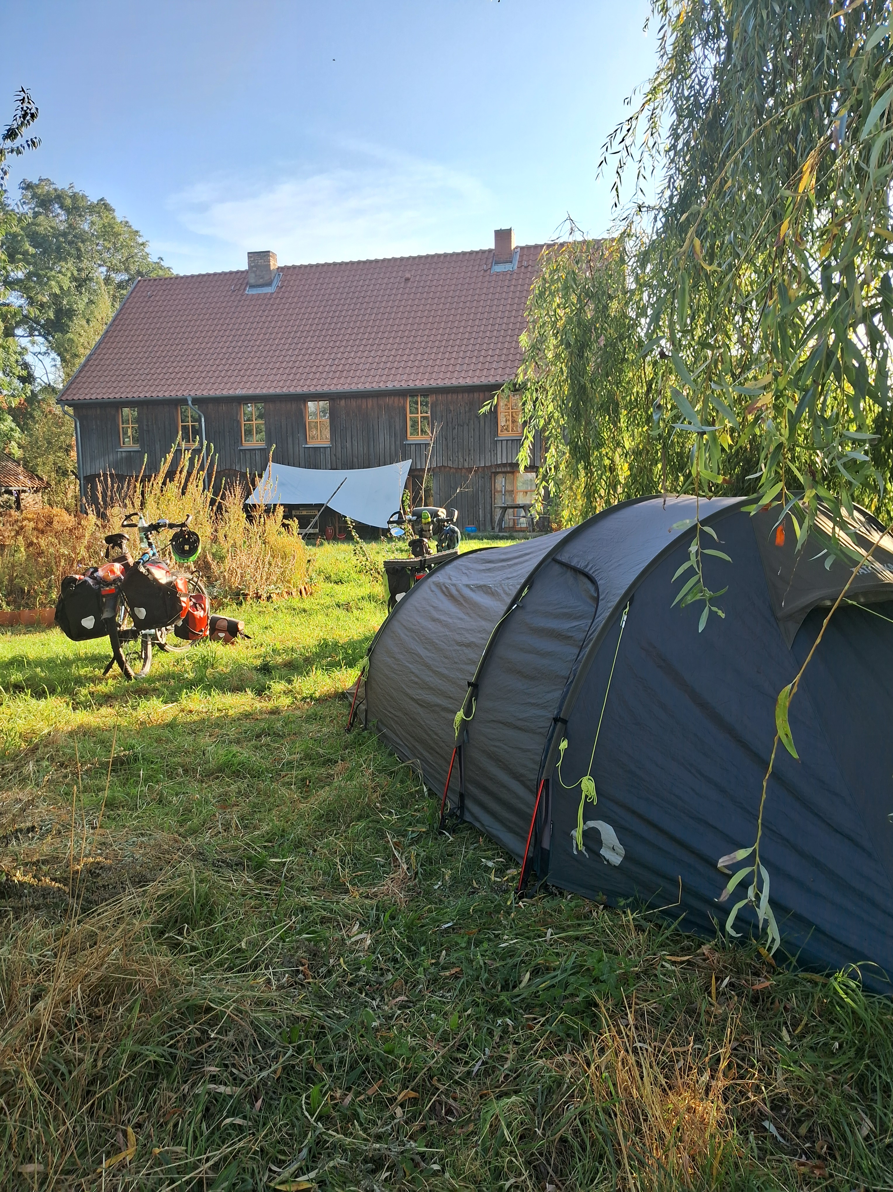 In der Stadt trafen wir vorm Laden ein vollbepacktes Radlerpaar, die unterwegs zu einem Festival waren. Dann machten wir Mittagspause im Park, und fuhren dann weiter, erst auf einem Fahrradweg, der dann natürlich irgendwann aufhörte, dann ging es auf einer Bundesstraße mit glücklicherweise wenig Verkehr weiter bis Pritzwalk, wo heute Abend “Herbstleuchten” mit Bands und Aktionen in der Stadt war. Wir haben von den Festivalradlern eine neue Plattform empfohlen bekommen: “onenitetent”, hier fanden wir einen super Ort, wo wir in einem schönen Garten unterm Storchennest mit Hunden und Katzen und Außendusche unser Zelt gratis aufstellen durften! Nach einer kalten Dusche draußen und leckerem Abendessen mit Tomaten von den Nachbarn ging es schon wieder im Dunkeln schlafen. Wir bekamen noch Besuch von der Katze im Zelt.