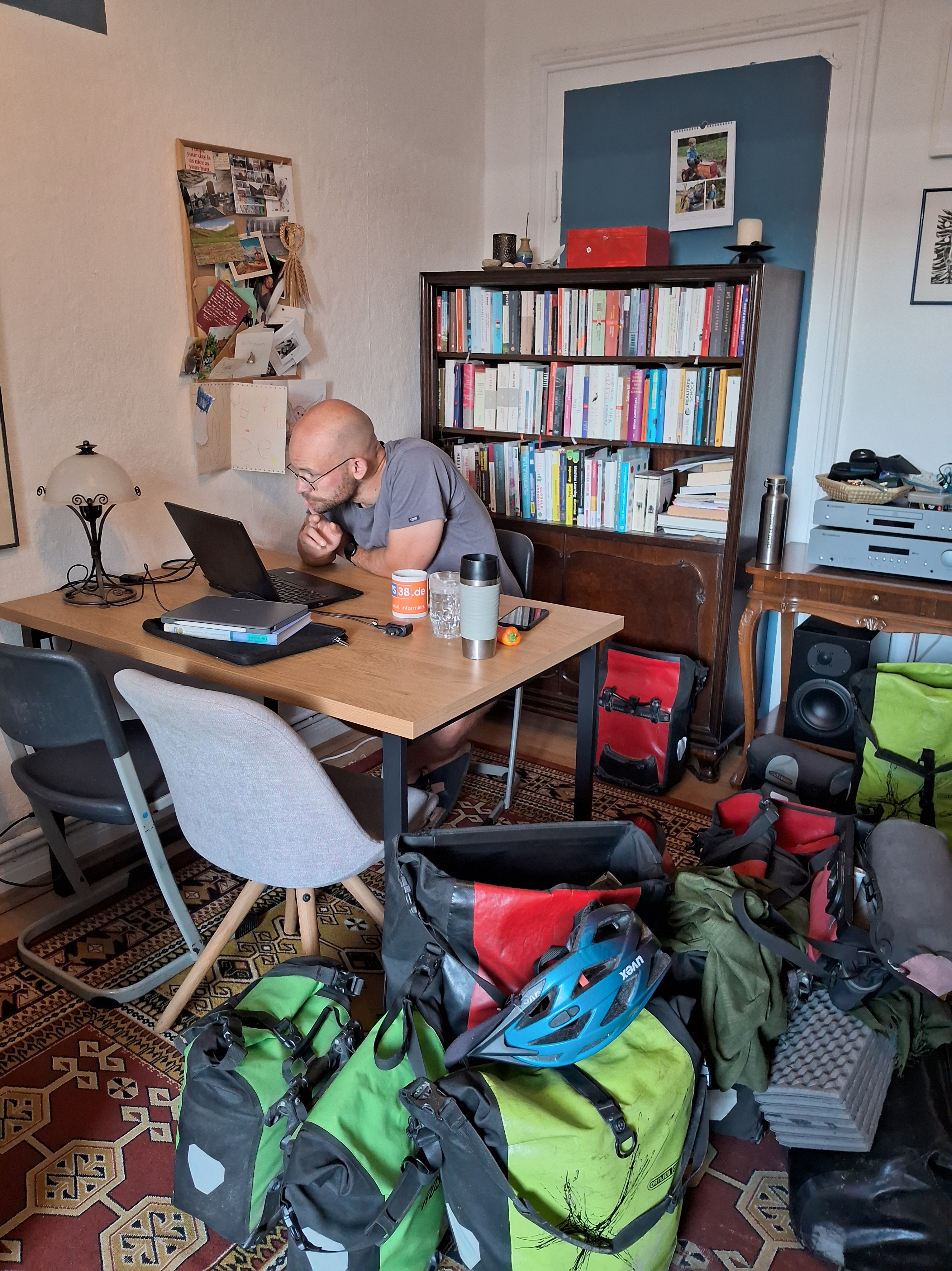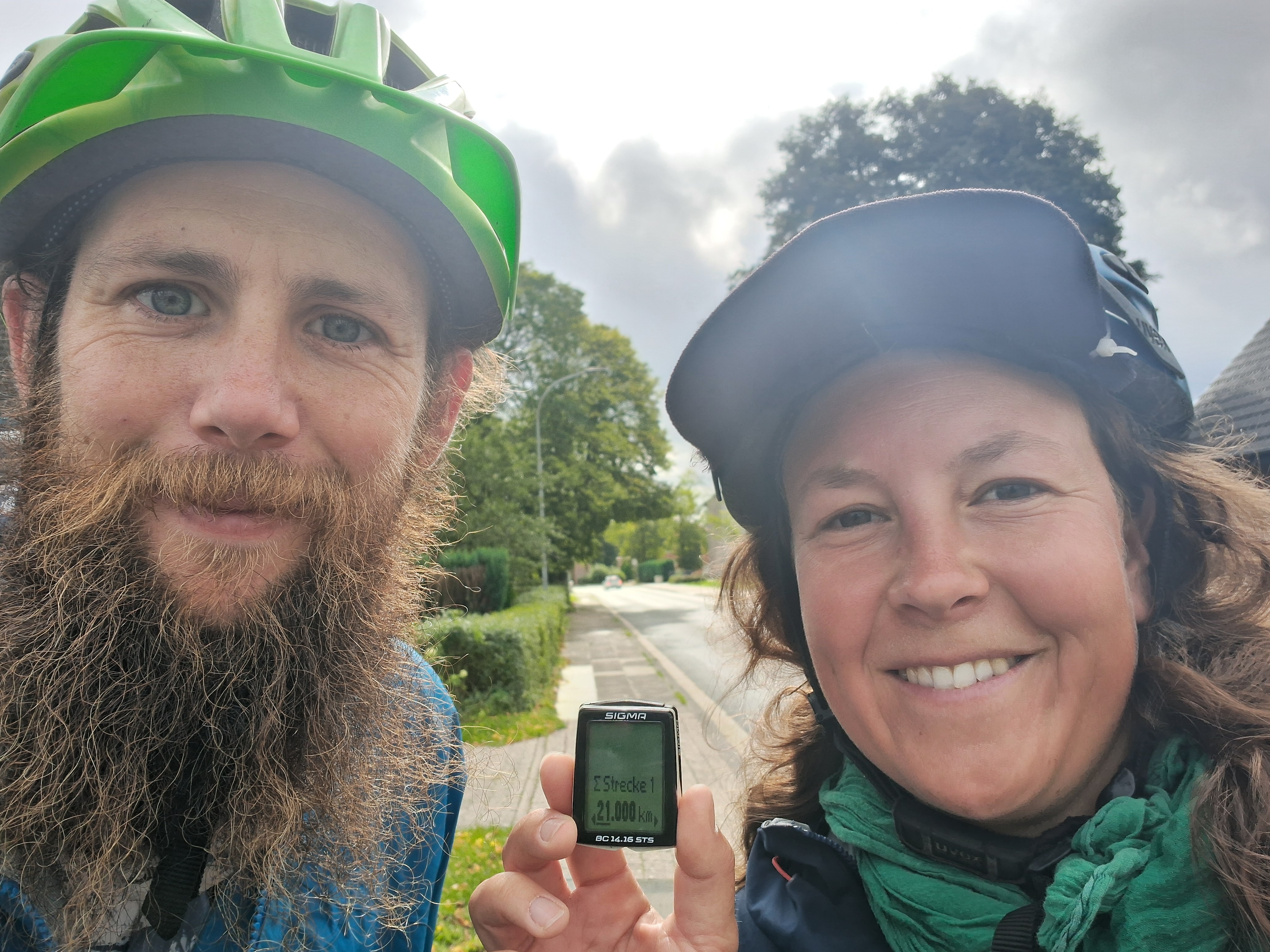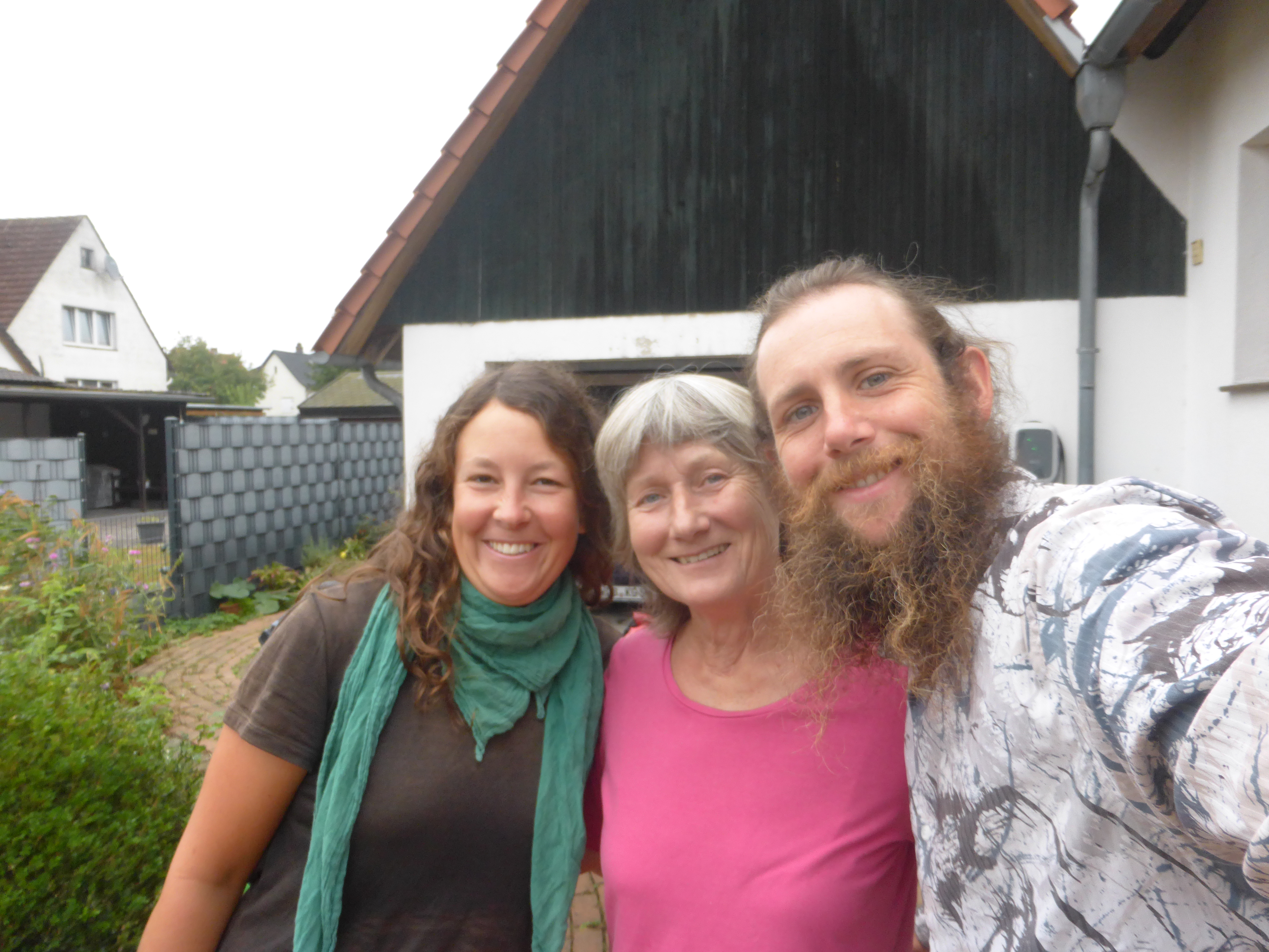 Für abends hatten wir uns bei Karin und Fritz eingeladen, die uns über warmshowers aufnahmen. Die beiden haben mit 55 Jahren mit dem Radreisen angefangen und sind seitdem 60000 Kilometer auf 4 Kontinenten geradelt. Wir kamen schon nachmittags an und wurden mit Kaffee und Kuchen empfangen. Wir verstanden uns super und konnten uns viel über unsere Radreisen austauschen. Die beiden fahren Anfang Oktober wieder los nach Spanien, Portugal und Marokko und haben uns fast Lust gemacht, noch weiter zu reisen. Nach einer warmen Dusche gab es leckeres Ofengemüse und Grillkäse und später von Fritz gebrautes Bier, der Abend wurde etwas länger und sehr gemütlich.