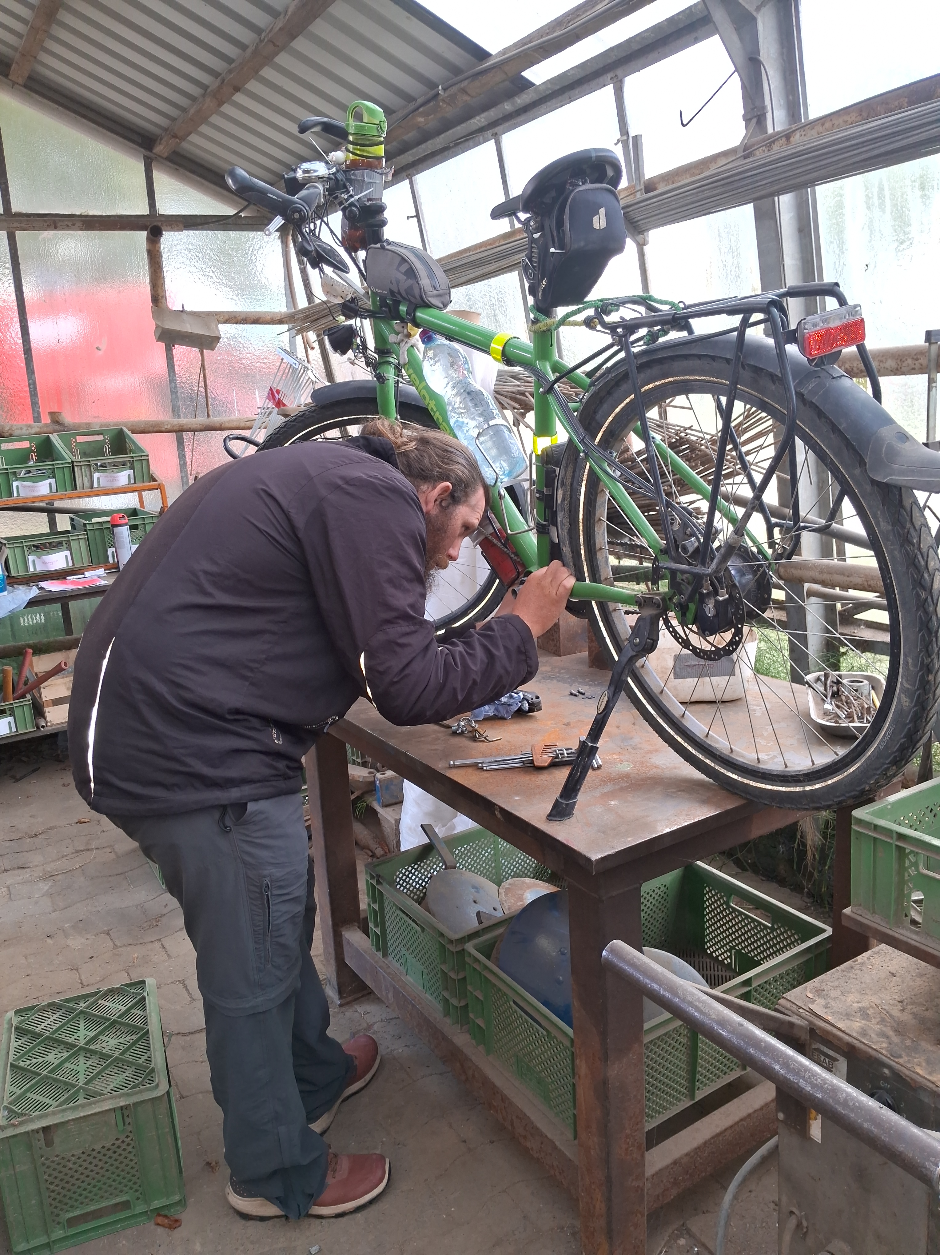 Am Donnerstag machten wir uns nach dem Ausschlafen und Frühstücken mit den unbeladenen Fahrrädern auf in die Gärtnerei, denn wir hatten wichtige Dinge zu tun, nicht nur Karins Tretlager wechseln.